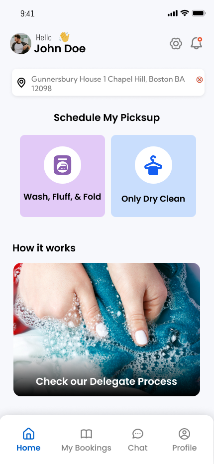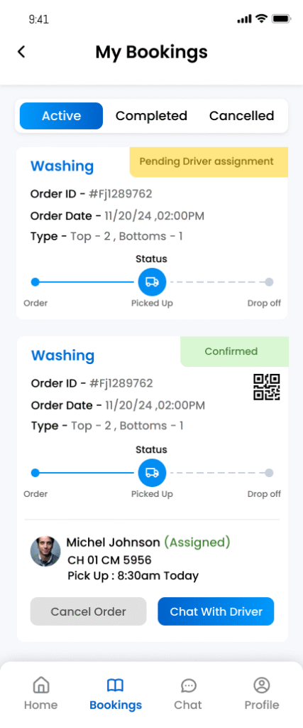 • Live status: Picked Up β†’ Washing β†’ Out for Delivery β†’ Delivered
