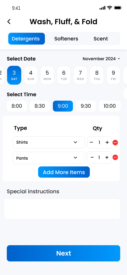 To design and develop a seamless laundry booking experience β€” from scheduling pickups to tracking delivery β€” along with a modern, responsive website for a laundry business to boost online bookings and customer retention.